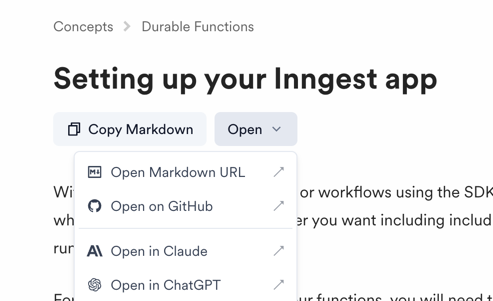 Our docs now have quick actions to copy or open the current page in Markdown format. You can also open a new conversation with the markdown URL in Claude, ChatGPT or other LLM providers. The Markdown format reduces the amount of context needed to be sent to LLMs and coding agents.